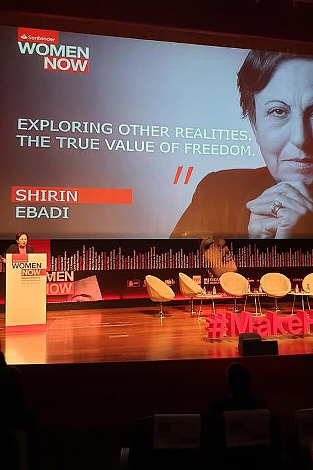 Se sube al estrado vestida de negro con una blusa coral, pero lo que realmente la viste es su sonrisa. Un aura de sabiduría la rodea y con su saludo reivindica a las mujeres de su país y es que en vez de hablar en inglés ella ha escogido dar su conferencia en la que es la primera jornada del Santander WomenNow, en farsí, el idioma de Irán. Estamos hablando de la Premio Nobel de la Paz en 2003 Shirin Ebadi.