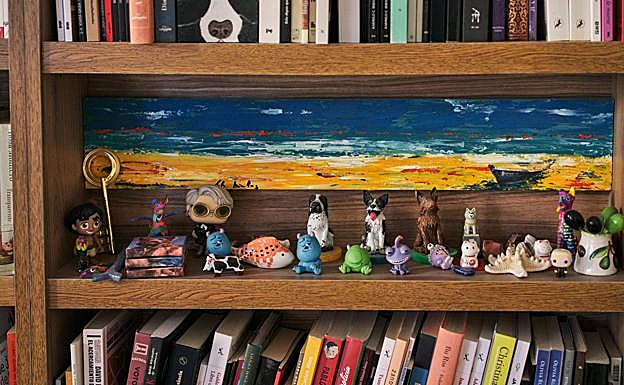 La escritora Elvira Sastre hace hueco en la biblioteca de su casa en la sierra madrileña a recuerdos de familia, regalos de lectores, premios literarios y animales mitológicos recogidos durante sus viajes por México.