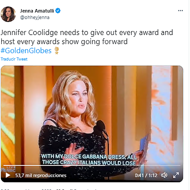 Después ha llegado el turno de una increíble Jennifer Coolidge ejerciendo de auténtica diva en el escenario a pesar de su sonado gazapo: la protagonista de The White Lotus (y ganadora del premio a Mejor Actriz de Miniserie, pero eso viene más adelante) ha confundido ¿sin querer? los Globos de Oro con los Oscar. «And the Oscar goes to...« ha salido por su boca al entregar la estatuilla. Twitter ha ardido de emoción y miles pedían que fuera ella la presentadora de todos los premios de la 'season award' de aquí a la eternidad.