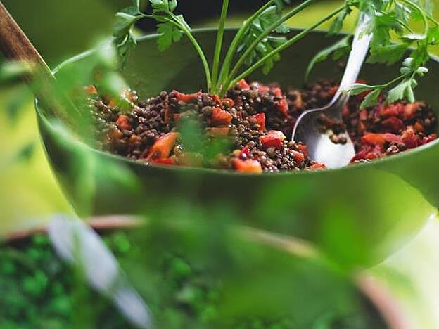Para comer. Ensalada de lentejas con espinacas y cúrcuma y una pieza magra de pollo ecológico a la plancha.