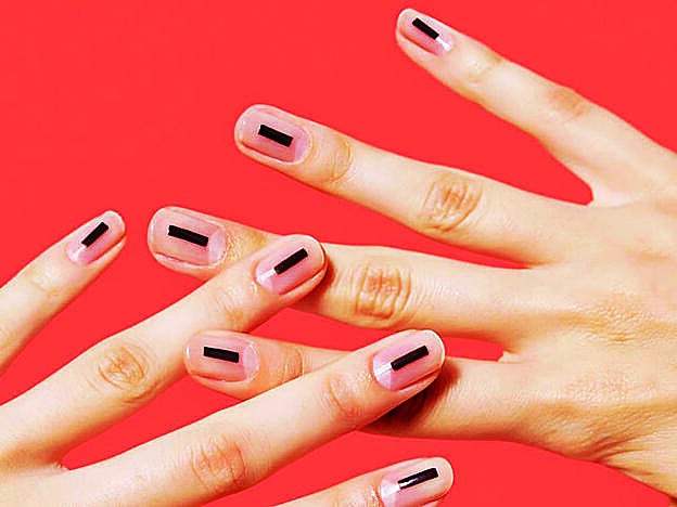 Minimalismo lúdico: Uñas limpias, perfectas, elegantes y con un solo punto en su interior, como una tachuela de color vivo y acabado lacado que destaca como una joya en los dedos. Es una idea de la manicurista neoyorquina Madeline Poole. @mpnails.