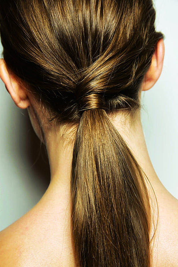 Darle un toque de elegancia a una cola de caballo baja solo requiere un poco de imaginación. María Baras lo resuelve con dos mechones sueltos a ambos lados, que se cruzan por encima de la goma para esconderla y se sujetan por detrás con una horquilla de moño invisible.