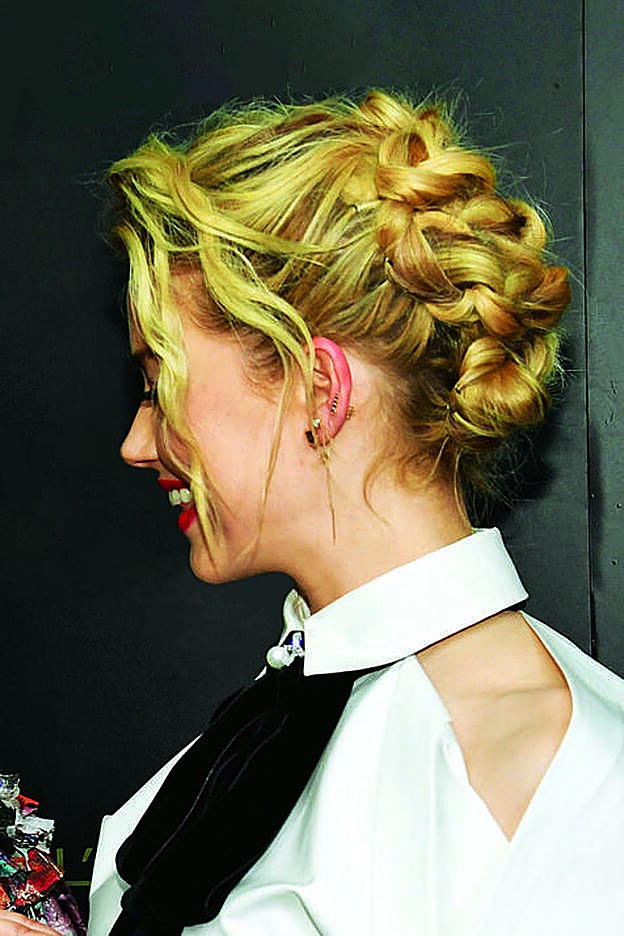 La textura ondulada de este recogido de Amber Heard “requiere primero un brushing y luego unas tenacillas. El trenzado suelto, circular y ascendente se inicia en la nuca y se funde en la parte superior”, explica Eduardo Sánchez.
