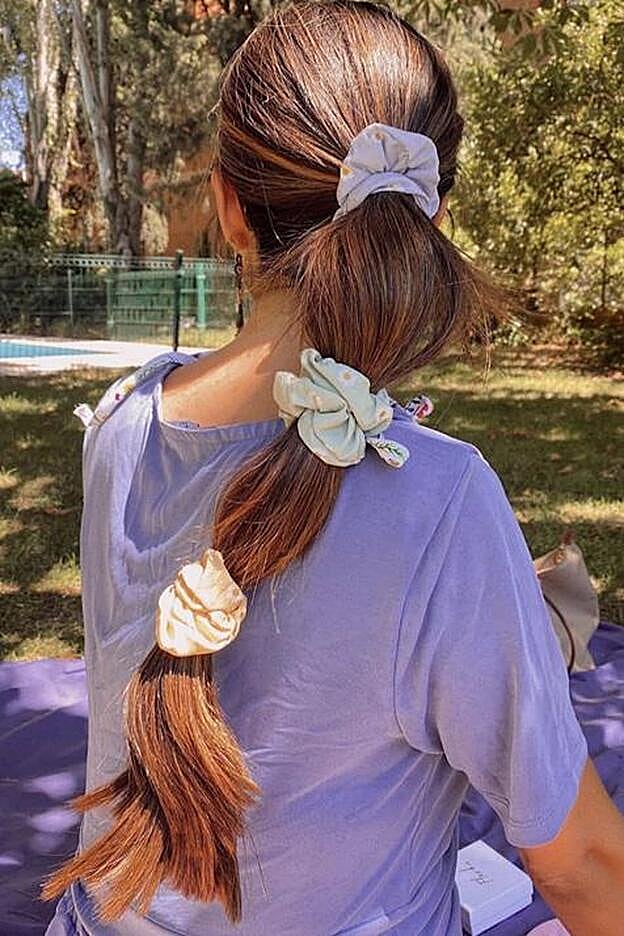 Pero en esta ocasión, la influencer ha decidido utilizar varios coleteros XXL de tela para conseguir un hairstyle con mucho encanto que no decepciona. En concreto ha utilizado tres en tono pastel con estampado de flores de la firma Flavhia.