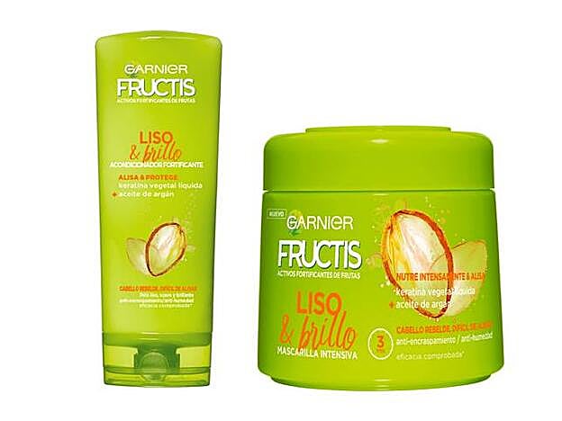 Desenreda, disciplina, protege la fibra capilar del encrespamiento y mantiene el liso por más tiempo sin apelmazar. Formulado con aceite de argán y keratina vegetal líquida. Hemos encontrado el acondicionador en Douglas por 3,35 euros y la mascarilla en Druni por 3,49 euros.