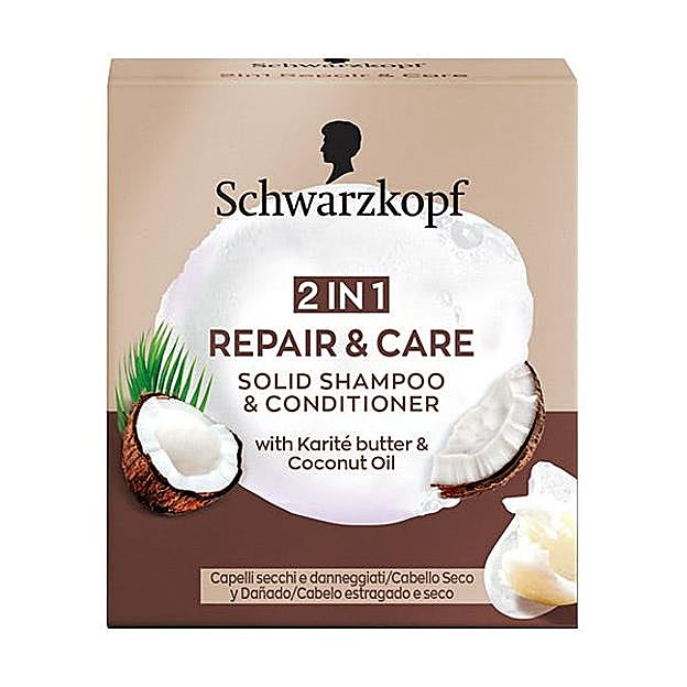 2 In 1 Repair & Care Solid Shampoo & Conditioner de Schwarzkopf es perfecto para el cabello dañado y seco. Su fórmula 2 en 1 suaviza y nutre la estructura del cabello, dejando el pelo cuidado intensamente hasta las puntas y visiblemente regenerado, flexible y saludable lleno de brillo. Precio: 4,95 euros.