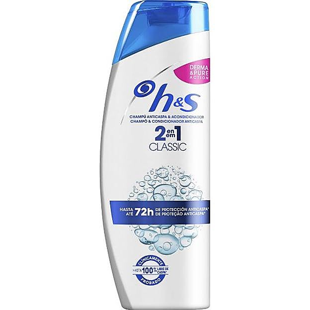 El champú anticaspa y acondicionador 2 en 1 Classic de H&S tiene una fórmula Derma&Pure que combate con eficacia el cuero cabelludo seco, graso y con picor para detener la caspa antes de que aparezca, pero además, limpia el cabello y lo mantiene hidratado y bonito. Precio: 4,15 euros.