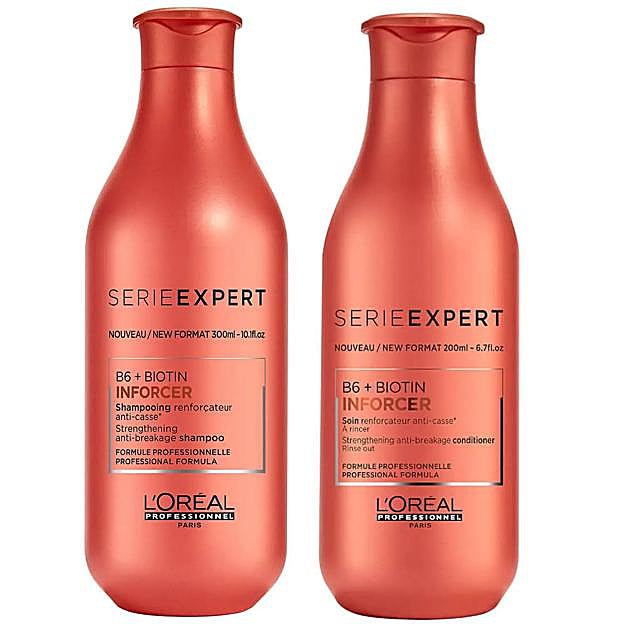 Otros dúos de champú y acondicionador que consiguen resultados increíbles en volumen y fortalecimiento del cabello, a muy buen precio, son el Inforcer Serie Expert de L'Oréal Professionnel, cuya fórmula restaura las fibras débiles y frágiles con propensión a la rotura, caída, encrespamiento, sequedad y puntas abiertas, basándose en la mezcla reconstructora de biotina y la vitamina B6, por solo 22,45 euros.