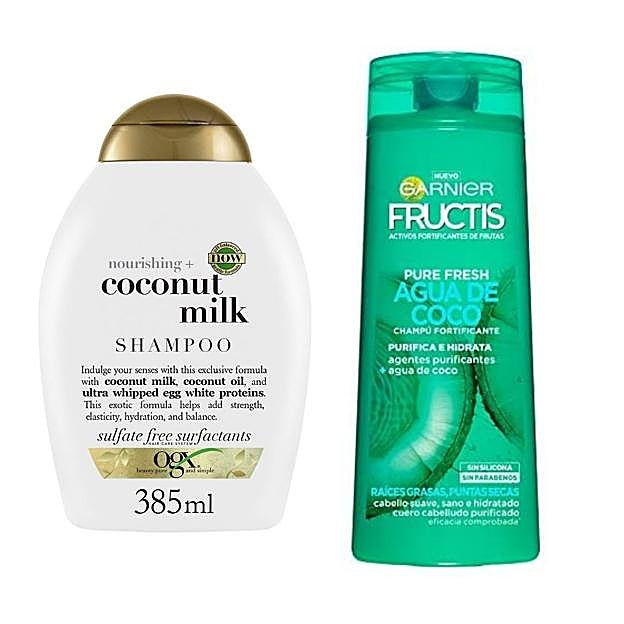 Por ello, aquí te dejamos otras dos opciones asequibles con las que probar los grandes beneficios del coco si tienes el pelo seco. El Champú Leche de Coco de OGX (7,90 euros), que contiene una lujosa y cremosa fórmula enriquecida con nutrientes de coco que dejan el pelo hidratado y suave, y Garnier Fructis Pure Fresh Agua de Coco (3,70 euros), que fortifica la fibra tras cada aplicación, purifica el cuero cabelludo y aporta hidratación de largos a puntas.