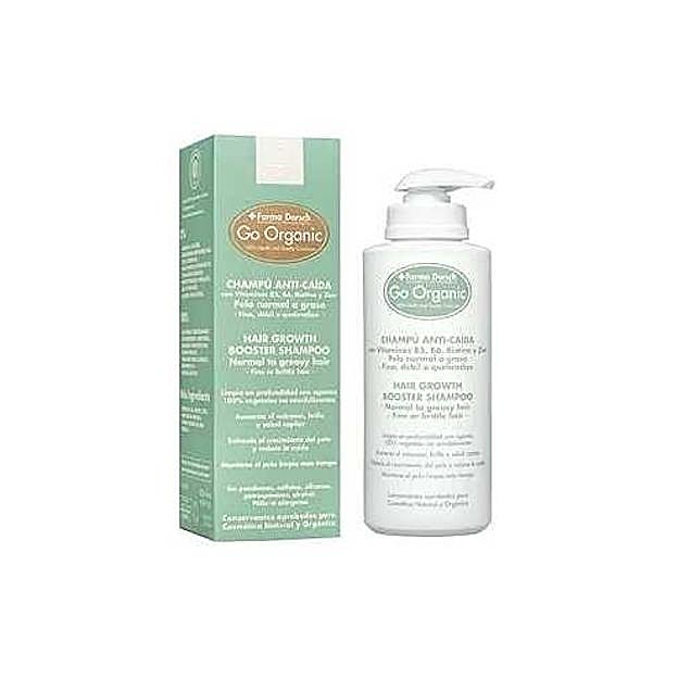 Hair Loss Shampoo de Go Organic de Farma Dorsch. Está especialmente formulado para combatir la caída del cabello y fortalecer cabellos normales a grasos. Libre de siliconas, sulfatos, PEGs y aceites, este champú utiliza potentes agentes limpiadores 100% vegetales para una limpieza profunda que no compromete la salud del cabello. Enriquecido con biotina, vitamina B5 y zinc, ofrece una solución integral para mejorar la salud capilar. Precio: 47 euros.