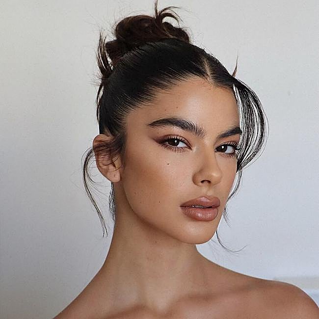 Moño alto con efecto clean girl. Este moño es una mezcla perfecta entre glamour y naturalidad, con mechones largos que enmarcan el rostro y aportan ese toque tendencia tipo clean girl aesthetic. Para lograrlo, solo tienes que hacer una coleta bien alta, retorcer el cabello formando el moño, y después dejar dos mechones largos y finos a ambos lados del rostro.