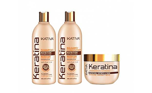Kativa Keratina es una línea pensada para nutrir y reparar el cabello dañado por decoloraciones, planchados y el uso del secador. El pack está formado por el Champú y Acondicionador Keratina en tamaño de 500 ml y el Tratamiento Intensivo Keratina 250 ml. La línea Keratina está formulada a base de Keratina hidrolizada y ceramidas. No contiene sal, sulfatos, parabenos o gluten. Ayuda a prolongar los efectos de la keratina en el pelo. Lo puedes conseguir en Dubal Cosmetics rebajado a 36 euros (Precio habitual: 40 euros).