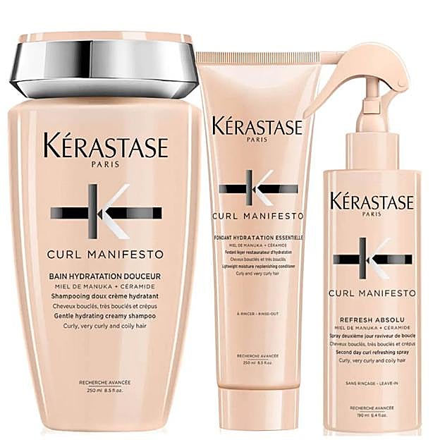 Pero, también puedes comprar otros packs para cuidar de tu pelo rizado, por ejemplo, como el Kit Curl Manifesto de Kérastase. El estuche contiene un champú que nutre, limpia en profundidad, calma y refresca, a base de miel de manuka y ceramidas. También un acondicionador que aporta mucha definición e hidratación. Y, un spray que revitaliza, hidrata y reactiva la definición de los bucles entre lavados.