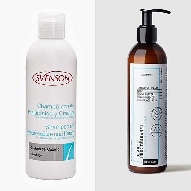 Si estás interesada en comprobar los beneficios del ácido hialurónico en el pelo, aquí te dejamos otras dos opciones que lo llevan. El Champú Hidratante de Svenson, que combina el ácido hialurónico, que tiene la capacidad de retener miles de veces su peso en agua, y la creatina, proteína que ayuda a recuperar la estructura original de la hebra del pelo. O la Mascarilla Intensive Repai de Beauté Mediterranea, un tratamiento perfecto para cabellos frágiles y dañados, debido a la exposición a factores externos ambientales, térmicos y químicos, que ayuda a retener la humedad del cabello aportando densidad, plenitud, suavidad y grosor.