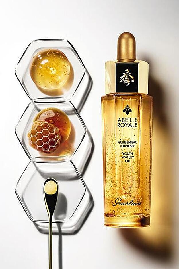 Se trata de el Aceite Acuoso de Juventud Abeille Royale de Guerlain. Un producto que brinda a la piel todo el poder de dos exclusivas: la Miel de la Abeja Negra de Ouessant y la Jalea Real exclusiva. Su fórmula revolucionaria alía el poder de un sérum, la riqueza de un aceite y la frescura de una loción, por lo que consigue que la piel quede estimulada, se redensifique y se alise de forma espectacular en un instante. Las microcápsulas de aceite liberan su eficacia reconstituyente en el último momento, y la tez se ilumina. De esta forma, la piel recupera un tacto suave y un aspecto carnoso incomparables, como la piel de un bebé.