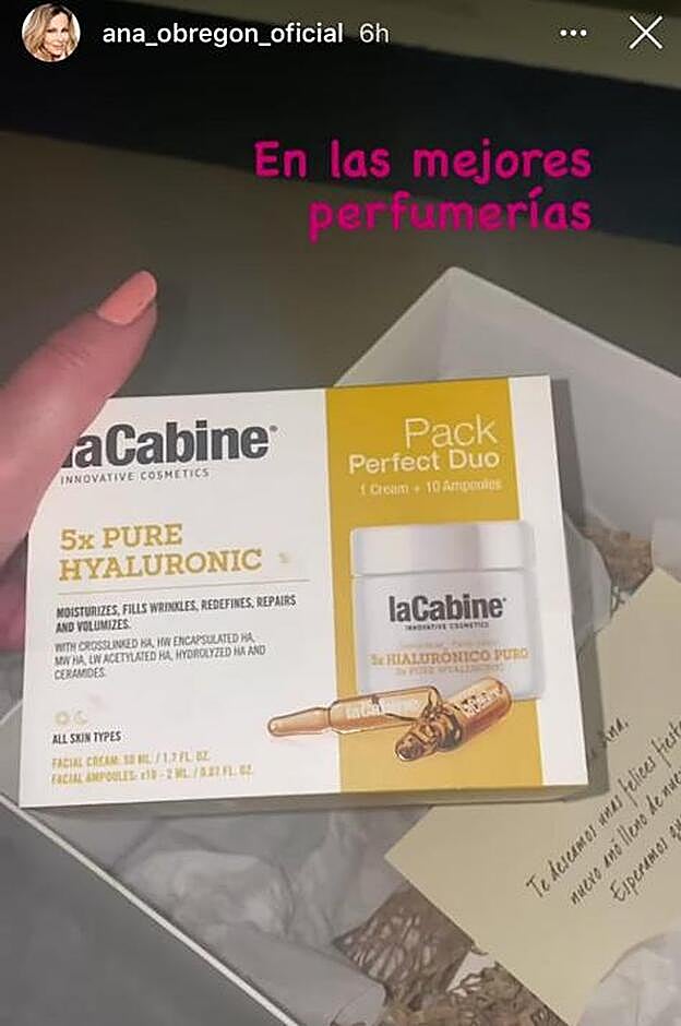 La actriz se refiere al pack Perfect Duo 5x Hialurónico Puro de laCabine (19,99 euros) que incluye unas ampollas y una crema hidratante y que es perfecta porque que hidrata, reestructura, rellena y reparar desde las capas más profundas de la piel. Dos productos que están formulados con 5 tipos de Ácido Hialurónico puro que hidratan la piel a diferentes niveles, rellenan las arrugas, reestructuran la epidermis, reparan las células de los efectos perjudiciales del sol y dan volumen a las pieles más maduras.