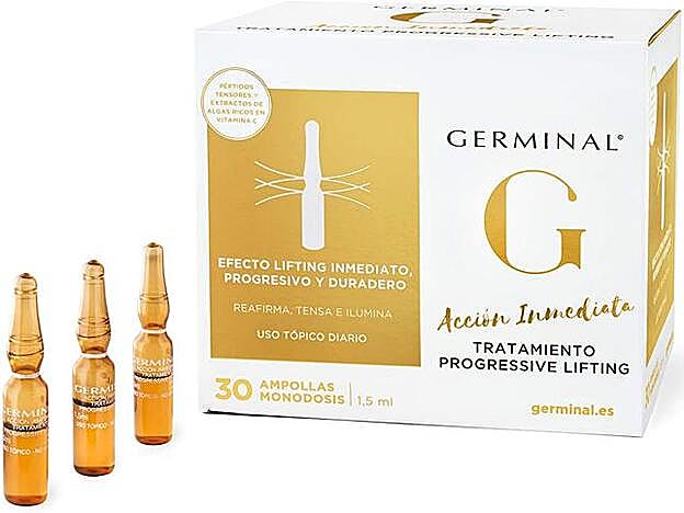 En concreto se trata de unas ampollas de Germinal que reciben el nombre de Accion Inmediata Progressive Lifting. Son un poderoso vitalizador de tejidos que combate las huellas de fatiga del rostro. Gracias a la presencia de una exclusiva combinación de péptidos, disminuye las arrugas y las líneas de expresión al mismo tiempo que aumenta la firmeza. Además, crea un film que protege la piel madura de la polución y produce un efecto lifting visible desde el primer día. ¿El resultado? Una piel más firme, tersa y luminosa gracias a un tratamiento con efecto lifting inmediato y progresivo: efecto flash a largo plazo.