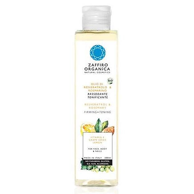 Aceite bio enriquecido con semillas de uva, aceite de almndras dulces, semillas de girasol, aceite esencial de romero y naranja amarga con acción reafirmante, elastizante y tonificante en cara, cuello, escote, brazos y piernas. Gracias a su mezcla de extractos puros de vitamina C, E, A, B1, B2, B6 y ácidos grasos insaturados como omega3 y ácido fólico retrasa el envejecimiento prematuro de la piel. Precio actual: 17,90 euros.