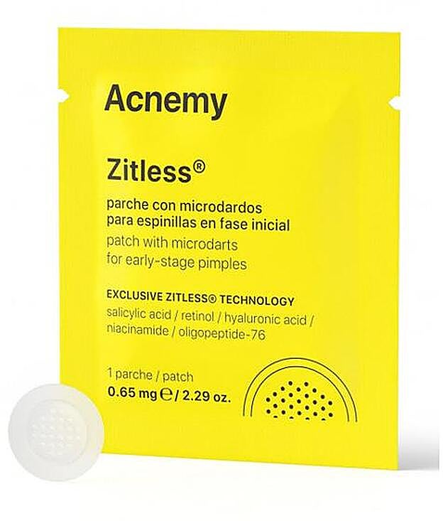 Hablamos de ACNEMY Zitless Parche Anti Granos, un parche que contiene 24 micro dardos compuestos por una mezcla única de ingredientes como retinol, ácido salicílico, ácido hialurónico, niacinamida y oligopeptido-76, ingredientes perfectos para combatir ese tipo de acné. El modo de aplicación es muy sencillo, solo tienes que pegar el parche en el grano y los microdardos penetrarán en las primeras capas de la piel y se disuelven liberando los activos y tratando el problema de raíz.