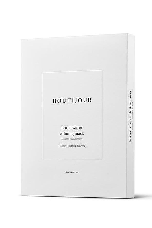 Lotus Water Calming Mask de Boitijour es una mascarilla con efecto calmante, que calma la piel y la llena de hidratación. Calma y alivia la piel del estrés medioambiental con agua de Loto, un agente pufirificante excelente. Además, ayuda a relajar e la piel irritada, dejándola hidratada durante horas. Incluye 5 mascarillas (44 euros).