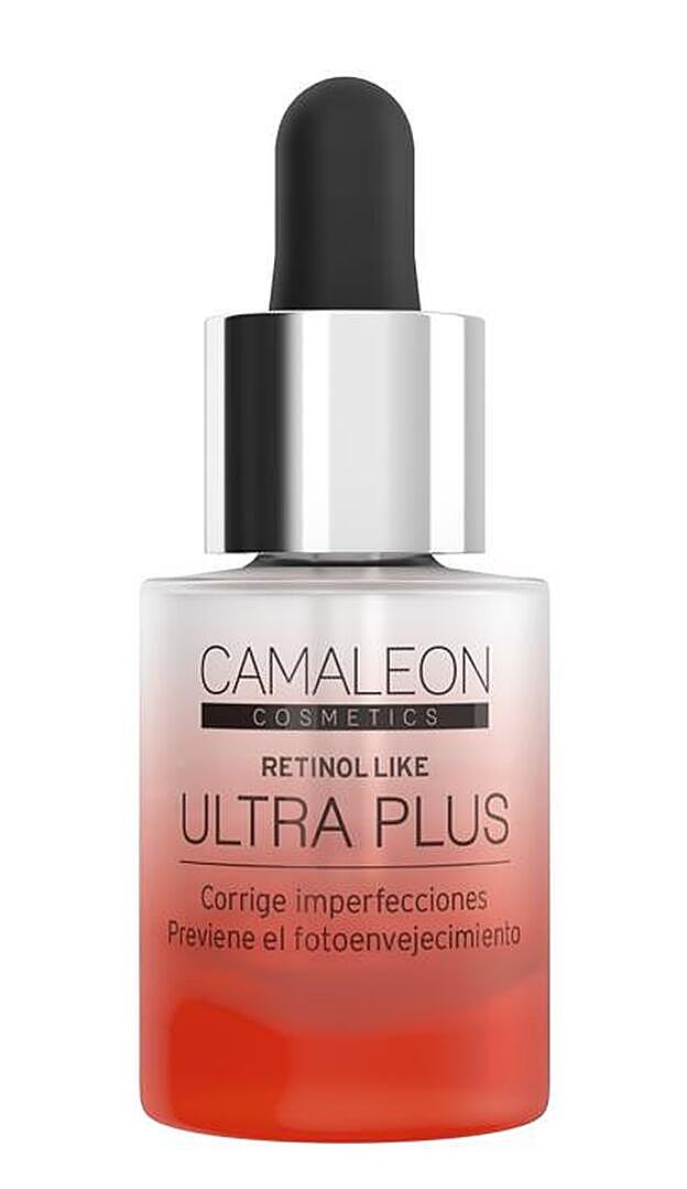 Camaleon Cosmetics Concentrado Ultra Plus-Retinol LIke es una combinación de activos antiarrugas y antiimperfecciones 94.6% de origen natural, que reducen las líneas de expresión y mejoran visiblemente las marcas y cicatrices. Se puede utilizar como sérum, es apto para veganos y para celíacos, y tiene como activos estrellas a el Bakuchiol, conocido por reducir las líneas de expresión, aumentar la elasticidad y mejorar la textura y suavidad de la piel; la Niacinamida y la Centella Asiática (15.90 euros).