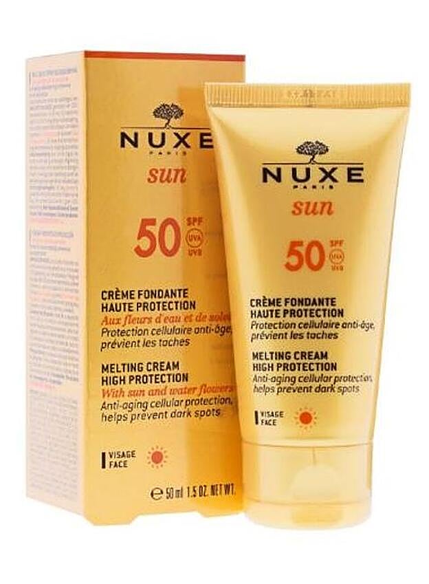 Nuxe Sun crema facial SPF50 (15 euros) es un protector solar alto con el que se puede combatir los efectos nocivos de los rayos UVA y UVB durante la exposición al sol. Gracias a sus principios activos, esta crema protege del envejecimiento prematuro de la piel, la hidrata, la calma y previene la aparición de manchas.