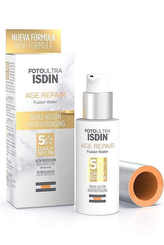 Fotoultra Isdin Age Repair SPF 50 (22 euros) ofrece una protección solar ultraligera y de uso diario que aporta hidratación intensa, absorción inmediata y ofrece una triple acción antifotoenvejecimiento: protege la piel del sol y la polución, repara el daño solar acumulado a nivel celular y revierte los signos visibles del fotoenvejecimiento. Es no comedogénico, oil-free (por lo que no da grasa) e hipoalergénico.