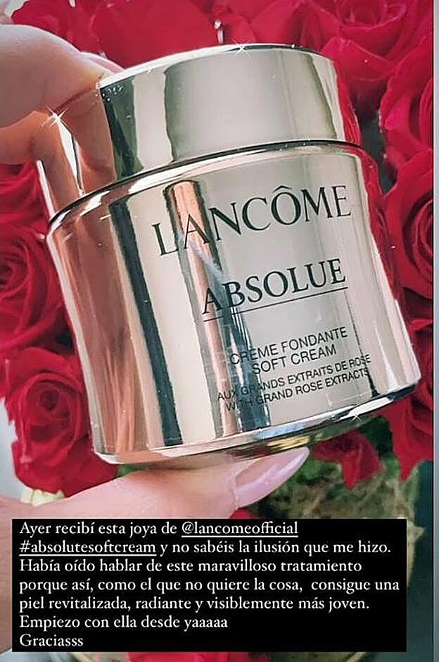 Se trata de la crema antiedad ligera Absolue Crème Fondante de Lancôme, un producto que parece fascinar a Vicky Martín Berrocal y que no ha dudado en compartir con sus seguidores de Instagram. "Ayer recibí esta joya y no sabéis la ilusión que me hizo. Había oído hablar de este maravilloso tratamiento porque así, como el que no quiere la cosa, consigue una piel revitalizada, radiante y visiblemente más joven. Empiezo con ella desde ya", escribió junto a una imagen del producto.