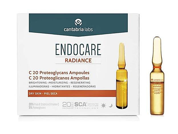 A continuación, usa las ampollas de Endocare Radiance C20 Proteoglicanos, con una fórmula que reduce los signos del envejecimiento y previene su aparición. Su elevada concentración de proteoglicanos la convierten en la fórmula ideal para pieles secas y/o deshidratadas. El SCA Growth Factor Technology se combina con Vitamina C y proteoglicanos para una acción antioxidante, regeneradora e hidratante para un aporte extra de luminosidad a la piel. Están disponibles también en PromoFarma por 19,52 euros el envase de diez ampollas.