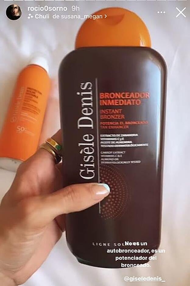 La influencer quiso recomendar a sus seguidores algunos productos que a ella le habían gustado y que son perfectos para el verano. Por ello, Rocío habló de la marca Gisele Denis y de su línea de cuidado solar. Una selección de productos de la que la también diseñadora ha destacado su potenciador de bronceado: "Es una maravilla, lo que hace es activar la melanina y se aplica antes de tomar el sol, como media horita antes, y luego aplicamos nuestro protector solar".