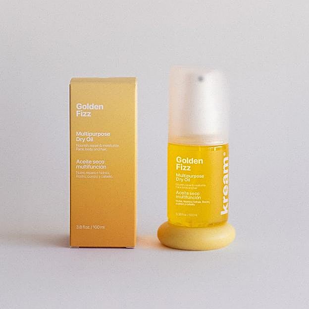 Golden Fizz de Kream. Golden Fizz es un aceite seco diseñado para nutrir, hidratar intensamente y reparar la función barrera de la piel. Es ieal para usar en el rostro, cuerpo y cabello todos los días del año. Un cóctel de aceites vegetales con un irresistible aroma a coco los 365 días del año. Precio: 19,95 euros.
