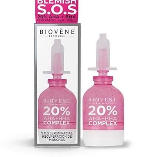 Sérum facial para la recuperación de manchas de Biovène. Con ácidos AHA + BHA exfoliantes y aceite de árbol de té orgánico, se consigue aclarar la piel, equilibrar y minimizar los poros, reducir la grasa y luchas contra las imperfecciones. Este tratamiento está indicado para pieles grasas y mixtas, propensas a las impurezas, poros obstruidos y puntos negros. Precio: 2,99 euros.
