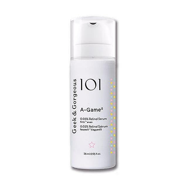 A-Game 5 de Geek&Georgeous es una emulsión sedosa y ligera que contiene Retinal (un tipo de Retinol) a potencia media, que corrige todos los signos del envejecimiento, siendo muy suave y cauteloso con la piel. Ayuda a las células de la piel a producir más colágeno y otros elementos estructurales, haciendo que la piel sea más joven, firme y elástica (15 euros).