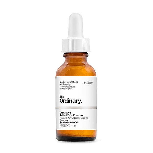 Granactive Retinoid 2% Emulsion de The Ordinary tiene una fórmula que mezcla dos formas de retinoides de nueva generación. Este producto utiliza tecnologías activas de retinoides de última generación que han demostrado lograr una mejor reducción de los signos de envejecimiento que el retinol sin irritación (9,80 euros)