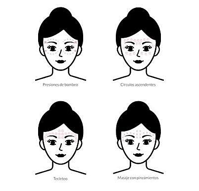 - Para terminar la estimulación manual, realizas un masaje con pinzamientos en las zonas de la frente y la sien para activar los músculos, realzando las cejas y favoreciendo el efecto lifting.