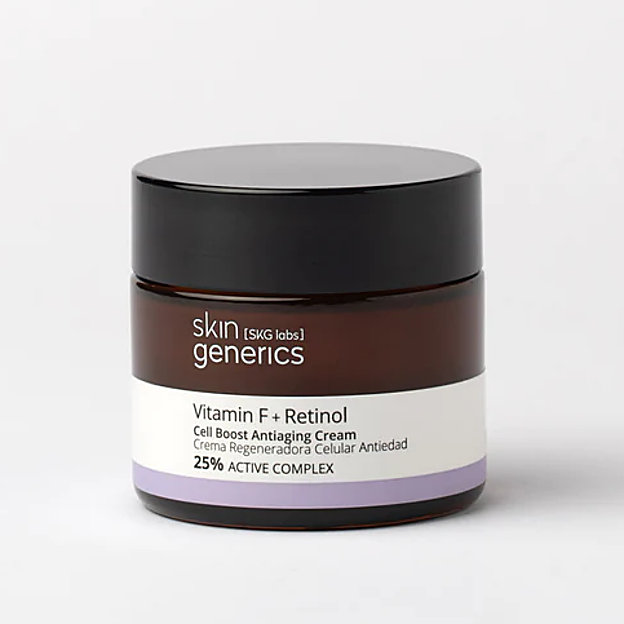 Crema Regeneradora Celular con Vitamina F+Retinol de Skin Generics. Se compone de vitamina F y de retinol, concentrando 25% de activos regeneradores, siendo un potente antiaging que renueva la piel, aportando luminosidad al rostro con un efecto flash. La vitamina F junto a la acción del retinol molecular que promueve la síntesis de colágeno, ácido hialurónico y elastina, reducen las arrugas y líneas de expresión. Precio: 32,95 euros.