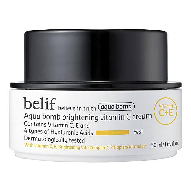 Y la Aqua Bomb Brightening Vitamin C Cream de Belif. Esta hidratante cuenta con un complejo de 4 ácidos hialurónicos para aumentar la producción de esta molécula, tener la hidratación y rellenar la piel por completo y las arrugas. La salicornia completa es hidratación exhaustiva y estimula la síntesis de ácido hialurónico para mayor elasticidad. El dúo de vitaminas C y E, revitaliza, potencia el brillo y se deshace de las manchas y líneas de expresión. La avena proporciona sus efectos reafirmantes. Y, los aceites y extractos de plantas con propiedades antioxidantes y antiiinflamatorias, energizan, protegen e iluminan.