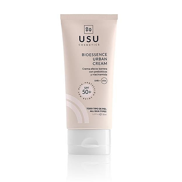 Bioessence Urban Cream de Usu Cosmetics. Crema de día iluminadora que hidrata y protege la piel de forma global frente a los agentes del medio externo al reforzar su función barrera y protegerla del sol. Formulada con prebióticos, niacinamida y un 63% de esencia hidratante. Ayuda a prevenir de los signos de envejecimiento provocados por la radicación ultravioleta UV, gracias a sus filtros solares fotoestables y de amplio espectro que protegen contra los rayos UVB como los UVA, y proporciona un efecto hidratante duradero y antioxidante. Precio: 28,70 euros.