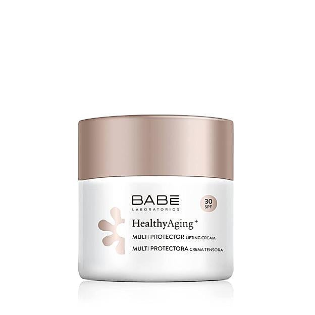 Consigue resultados por partida doble en prevención y corrección del envejecimiento con la HealthyAging+ Multi Protectora Crema Tensora de Babe. Esta hidratante de día protege de la acción dañina de las radiaciones solare y otros agresores (infrarrojos, luz azul, contaminación), gracias a su factor de protección SPF30 contra UVB. UVA, IR y HEV, a la par que rejuvenece la piel en general gracias a sus activos antiedad.