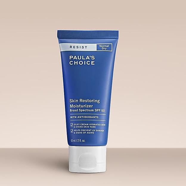 Hidratante Antienvejecimiento Restauradora SPF 50 de Paula's Choice. Esta hidratante multifunción con SPF 50 protege la piel del sol y previene la aparición de los signos prematuros de la edad y los daños causados por la exposición a los factores ambientales, mientras que las hojas de manteca de karité dejan la piel suave e hidratada. Su fórmula antienvejecimiento contiene ingredientes que ayudan a igualar el tono de la piel, como la niacinamida y el regaliz, para conseguir un tono más uniforme y un aspecto rejuvenecido. Precio: 32,40 euros.