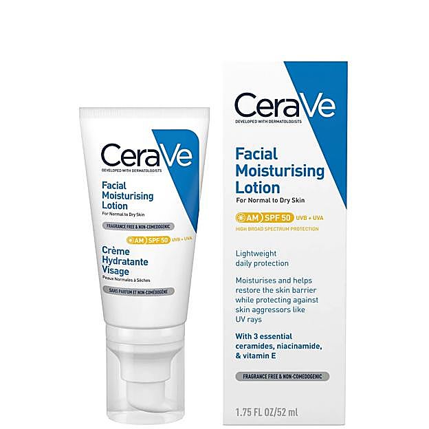 CeraVe AM SPF50 de CeraVe. Esta rica crema, que proporciona una hidratación duradera junto con protección UV, busca simplificar y mejorar tu rutina de cuidado de la piel. Potenciada con una mezcla de tres ceramidas, la crema sella la hidratación para crear el aspecto de una piel más suave y tersa. Con la tecnología patentada MultiVesicular Emulsion de la marca, aporta una intensa hidratación durante todo el día y proporciona un efecto revitalizante. Como toque final, la niacinamida equilibrante y la vitamina E de esta crema hidratante busca equilibrar el cutis para disfrutar de un tono de piel de aspecto uniforme. Precio: 15,45 euros.