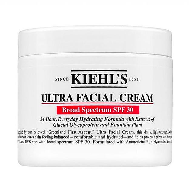 Ultra Facial Cream Spf30 de Kiehl's. Este tratamiento facial se absorbe fácilmente en la piel con una textura ultraligera proporcionando una hidratación duradera durante 24 horas. Es la crema hidratante para el rostro top favorita de los clientes de la firma. Consigue una máxima hidratación verificada con un estudio de alta innovación realizado, creando un mapa facial en 3D, escogiendo 60 puntos diferentes del rostro para comprobar la durabilidad de la hidratación en la piel. Precio: 22,75 euros en Druni.