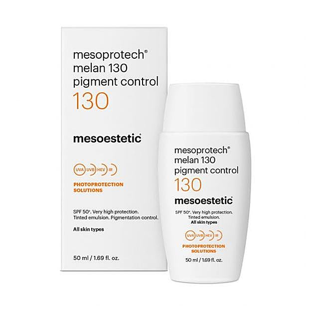 Melan SPF130+ Pigment Control de Mesoestetic. Su principal objetivo es prevenir la aparición de manchas a través de la regulación de la síntesis de la melanina. Así, esta crema solar para la cara con color combate la hiperpigmentación de forma eficaz al mismo tiempo que te protege de las radiaciones UVA, UVB, HEV e I-RA con un espectro solar que dobla el mínimo de lo exigido.