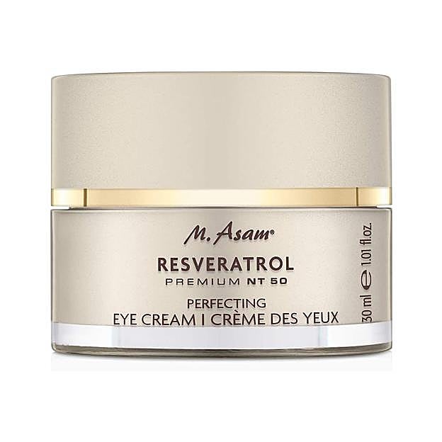 Crema de ojos Resveratrol de M. Asam. Adaptada a la sensibilidad del contorno de ojos, esta crema sin perfume alisa arrugas al instante gracias a su exclusiva tecnología NT50 que rejuvenece las células de la piel. Además, su fórmula con resveratrol, ácido hialurónico cruzado y un péptido alisador, hidrata en profundidad. Para una mirada joven y libre de los efectos del paso del tiempo.
