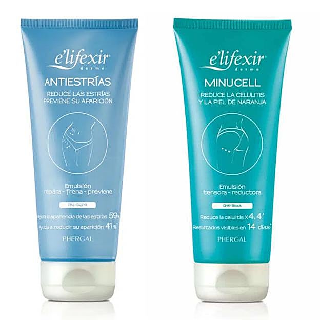 E'lifexir Antiestrias está formulado con Green Bean Extract que frena la aparición de las estrías reforzando la flexibilidad de la piel y Lipopéptido PAL-GQPR, que reconstruye el tejido dañado y reduce la profundidad de las estrías. Además, contiene Manteca de Karité y Manteca de Cacao que hidratan y reparan la piel. Por otro lado, la crema reafirmante Minucell contiene cafeína, creatina y el tripéptido GHK, que actúa a 3 niveles reafirmando, reduciendo y definiendo tu figura (13,70 y 11,64 euros respectivamente).