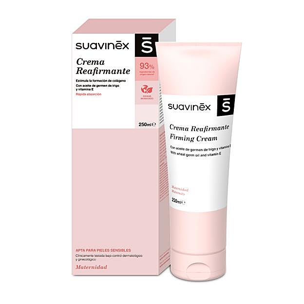Por su parte, la crema reafirmante de Suavinex, ayuda a la estimulación de la síntesis del colágeno y combate la flacidez mejorando el tono y firmeza de la piel tras el embarazo. Formulada con un 93% de ingredientes de origen natural, entre los que se encuentran la vitamina E y manteca de karité para hidratar y reestructurar.