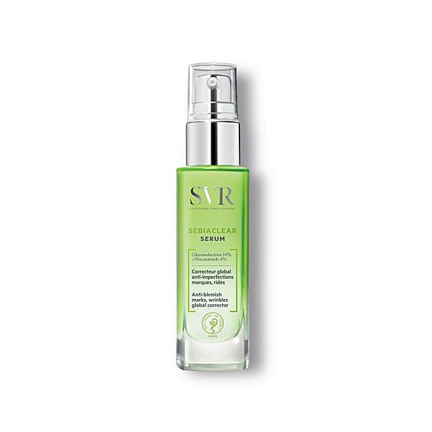 Uno de los cosméticos que propone la experta en dermocosmética es el sérum Sebiaclear de SVR (16,54 euros), un suero con corrección global anti-imperfecciones, marcas y arrugas, apta para todas las pieles sensibles, pero especialmente para las grasas con tendencia acneica. Su uso diario elimina granos, puntos negros, poros dilatados y marcas residuales, y protege a la epidermis de la polución y otros agentes externos. Todo gracias a su fórmula con un 14% de gluconolactona más niacinamida y ácido hialurónico.