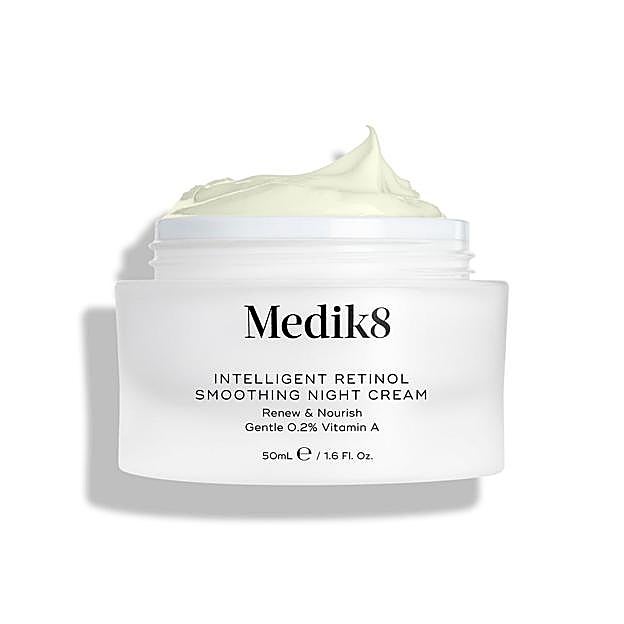 Intelligent Retinol Smoothing Night Cream de Medik8. Es una crema de noche antiedad a base de retinol que renueva y alisa tu cutis mientras duermes. Con un 0,2% de retinol de liberación lenta y antioxidantes nutritivos, esta crema combate los signos del envejecimiento, mejora la textura de la piel y proporciona hidratación profunda durante la noche. Ideal para quienes buscan un tratamiento efectivo y fácil de usar, este producto deja la piel visiblemente más tersa y rejuvenecida cada mañana. Perfecta para principiantes en el uso de retinol o para un régimen nocturno conciso. Precio: 70 euros.