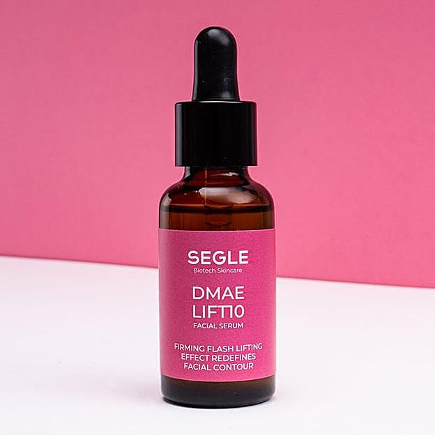 Sérum DMAE Lift 10 de Segle. Mejora visiblemente la firmeza y elasticidad, previene el descolgamiento y remodela el óvalo facial y aporta un efecto flash o 'buena cara': en minutos borra los signos de la fatiga, hidrata, atenúa las arrugas de expresión. Sus activos como DMAE, con efecto antioxidante, hidratante y tonificante o el extracto del alga Heamatococcus que evita la rotura de las fibras de colágeno, consiguen reorganizar la piel en su interior y reafirmarla. Precio: 49,90 euros.