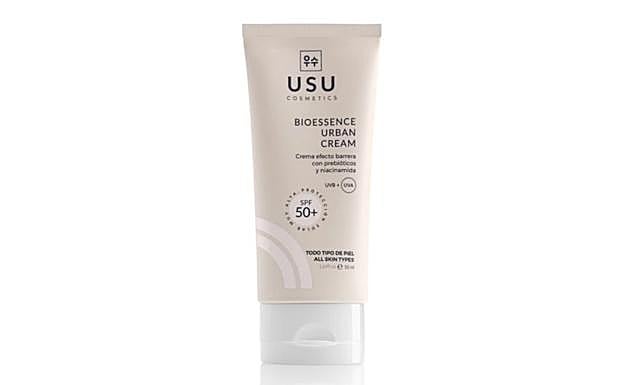 Crema de día iluminadora con prebióticos, niacinamida, filtros solares de amplio espectro y un 63% de esencia hidratante que refuerza la función barrera de la piel para protegerla de forma global y repararla de los daños ocasionados por los agentes del medio externo. Contiene prebióticos que restauran la barrera cutánea; niacinamida que ayuda a mantener la hidratación; factor de protección 50, que bloquea el daño celular producida por la radiación ultravioleta; y complejo vegetal que hidrata y calma la piel proporcionando una sensación refrescante (26,50 euros en USU Cosmetics).